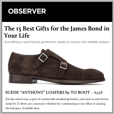 Observer picked sued "Anthony" loafers by To Boot New York for its holiday list of "The 15 Best Gifts for the James Bond in Your Life."