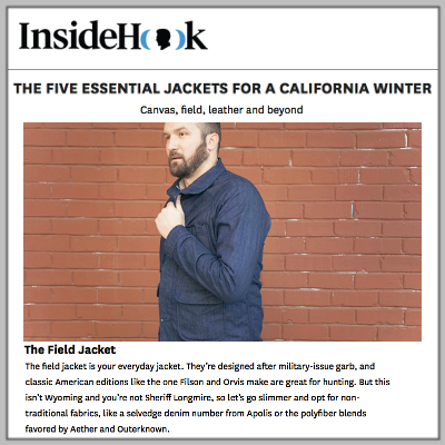 /Two jackets by Apolis - the Selvedge Denim Chore Jacket and the Transit Issue Quilted CPO Jacket - were featured in an Inside Hook write-up about essential lightweight jackets for a California winter.